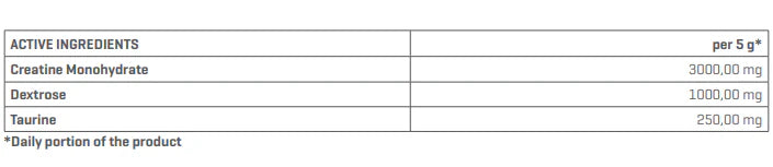 Creatine monohydrate (60%); dextrose (20%); acidity regulator – citric acid; aromas; taurine (5%); beet juice concentrate for raspberry and watermelon flavor; multi-fruit flavor color – beta carotene; kiwi dye – copper chlorophyll and chlorophyllin complexes; sweetener – sucralose.
