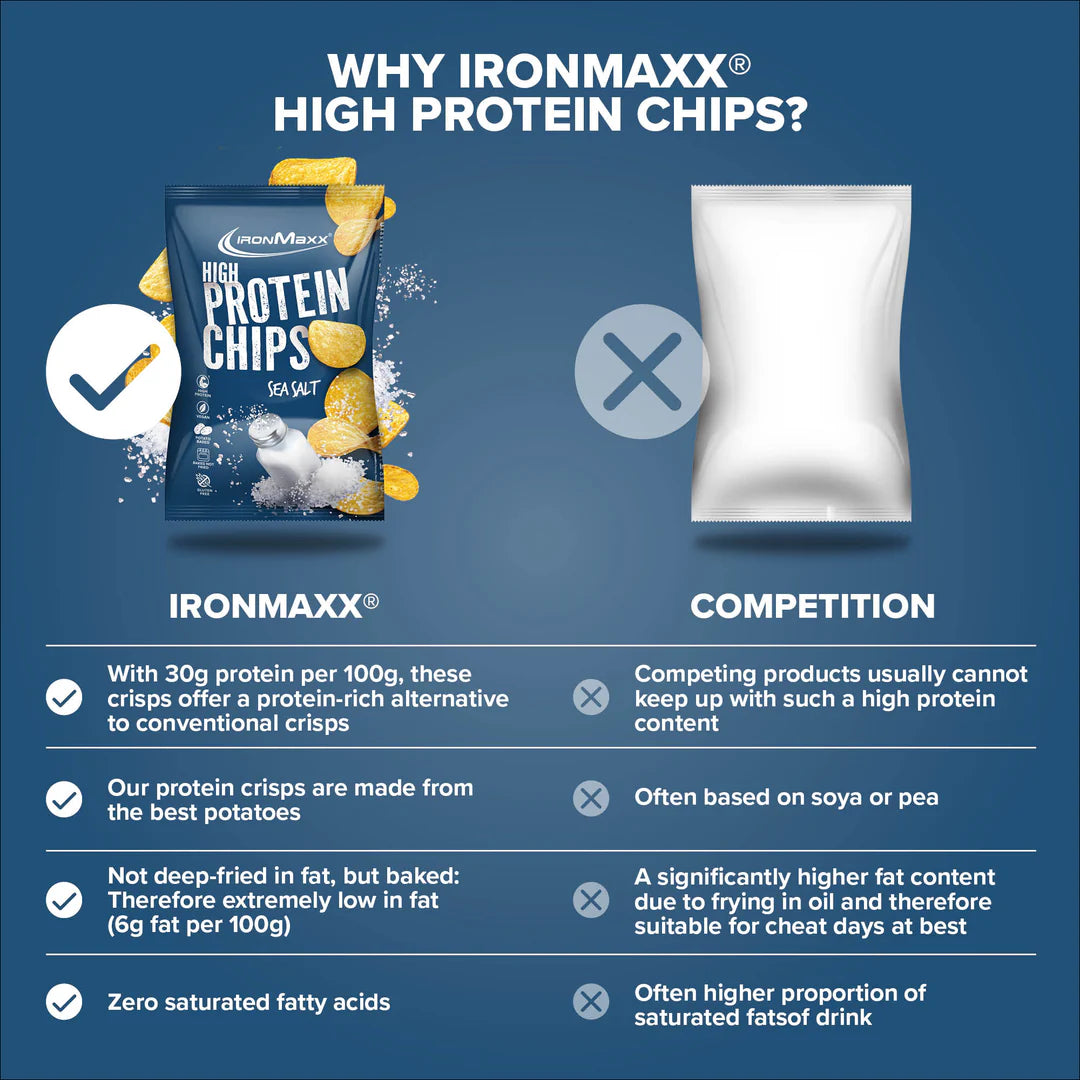 The IronMaxx® High Protein Potato Chips are the perfect fitness snack for anyone who wants full flavour while reaching their fitness goals. With a hefty 30 g of protein per 100 g, they effectively support muscle building – all without the guilt.