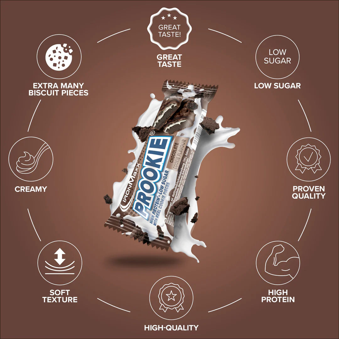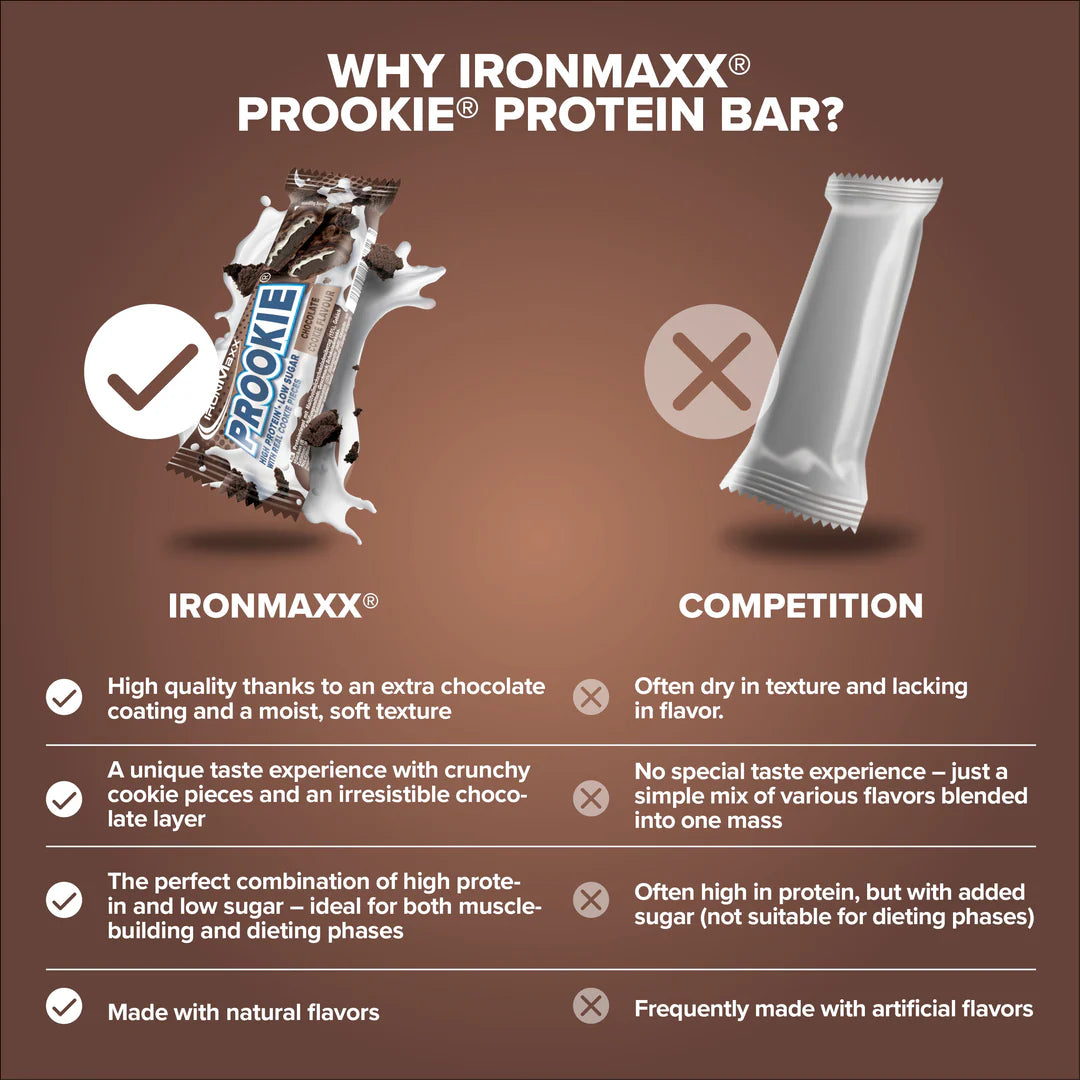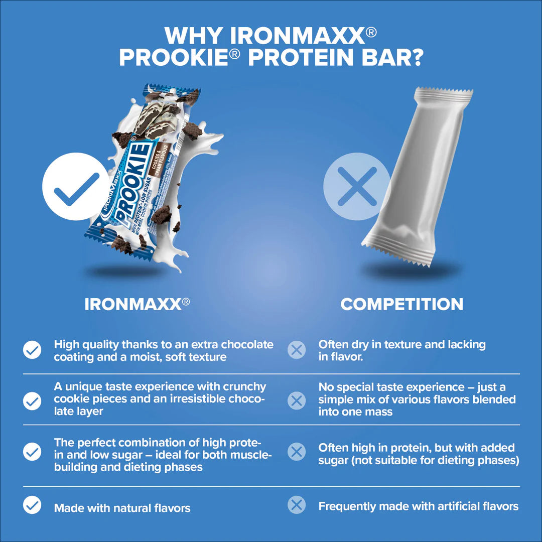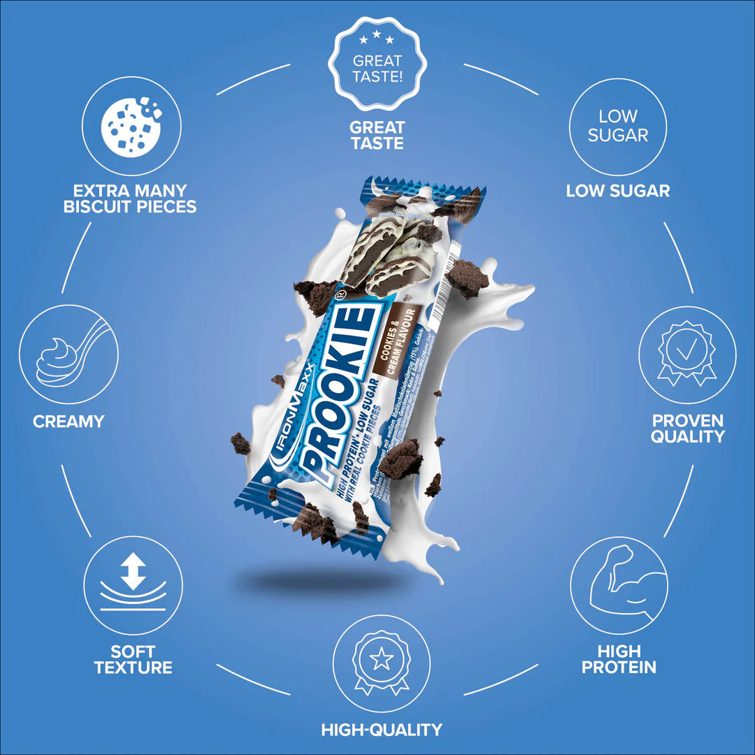Prookie® – The Crunchy Protein Cookie Bar with Just 1.2 g Sugar IronMaxx® Prookie® – the protein bar with authentic cookie flavour and powerful nutrition. With 30 g of high-quality protein per 100 g, it actively supports muscle growth and recovery – perfect for sport, fitness and active lifestyles. Crunchy cookie pieces, a smooth texture and a fine white chocolate coating make the Prookie® a true taste experience – with only 1.2 g of sugar per bar. Perfect as a post-workout snack, at the office or on the go – the Prookie® delivers protein power with indulgence.Suggested Use
